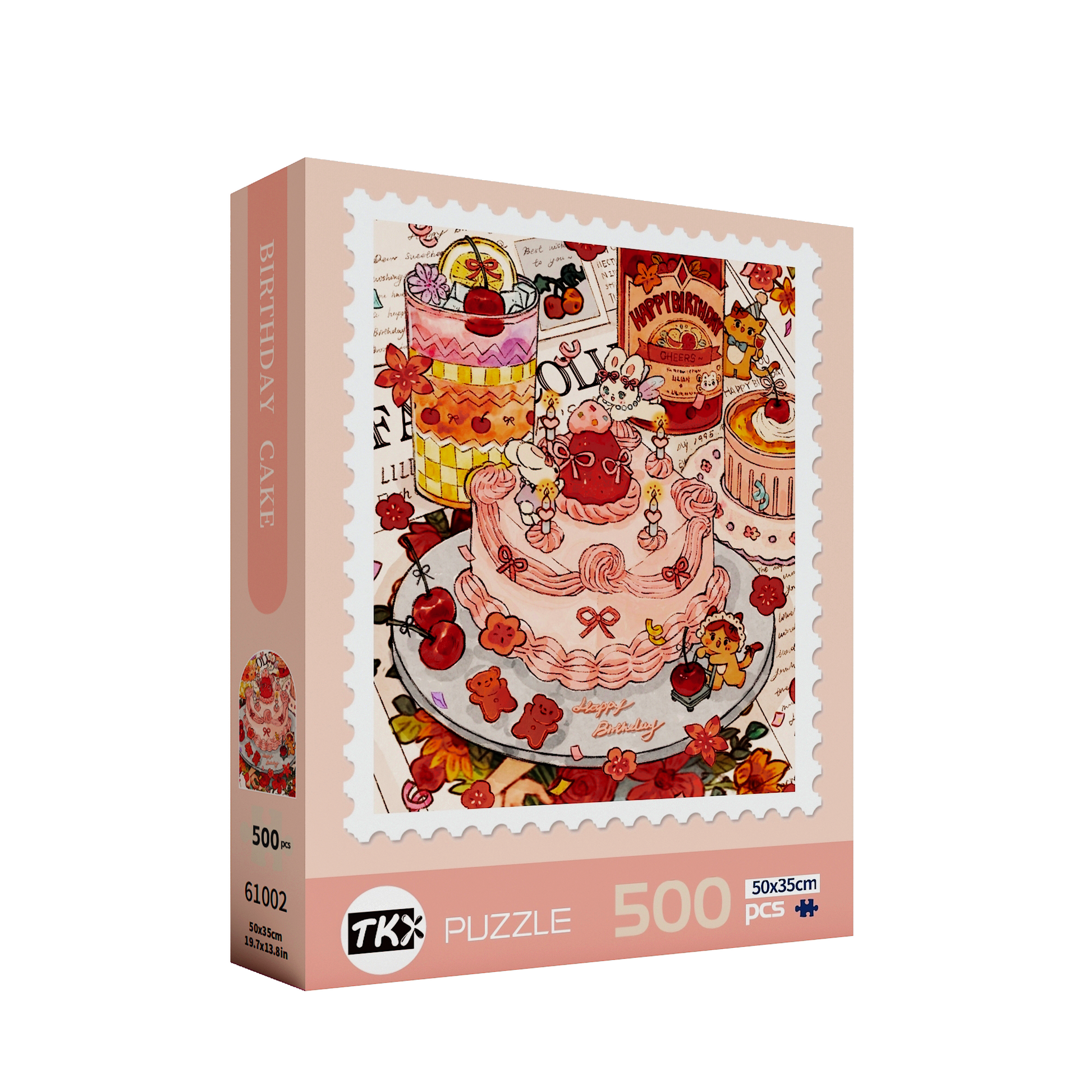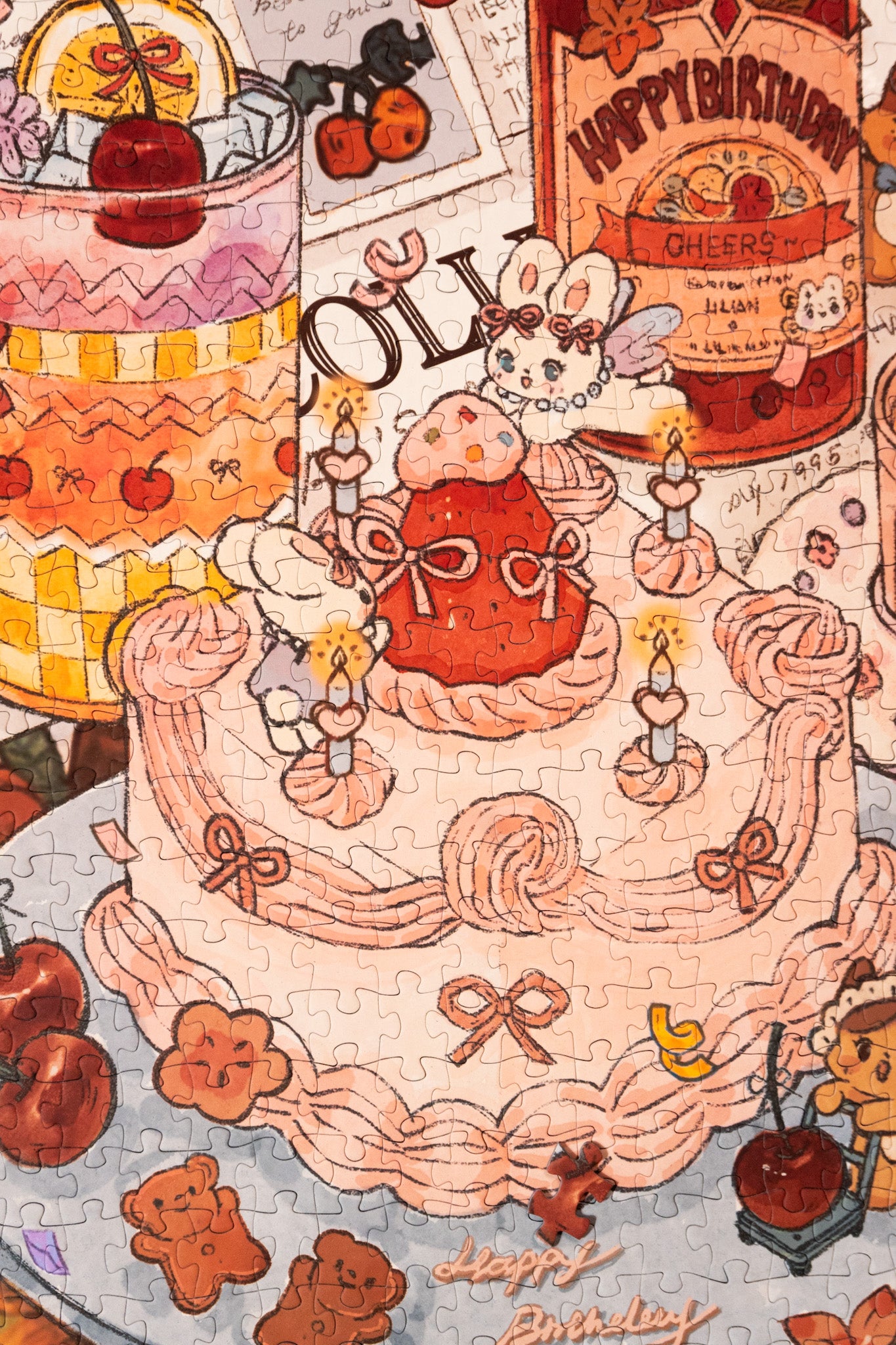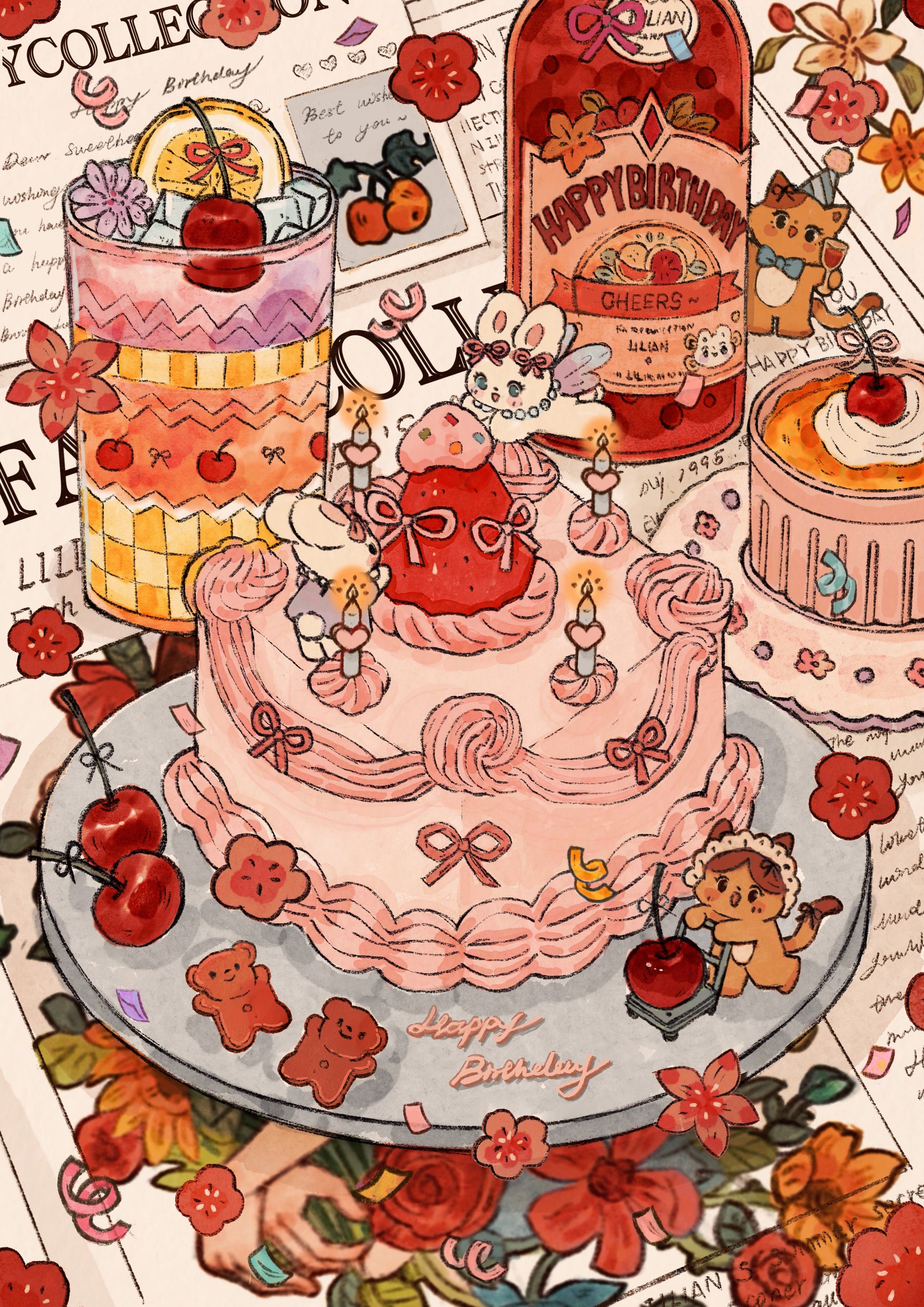 A sweet birthday scene that’s as adorable as it gets! A pink cake garnished with cherries with a strawberry on top! Surrounded by the cutest bunnies and kittens, all celebrating with happy smiles and a sprinkle of love