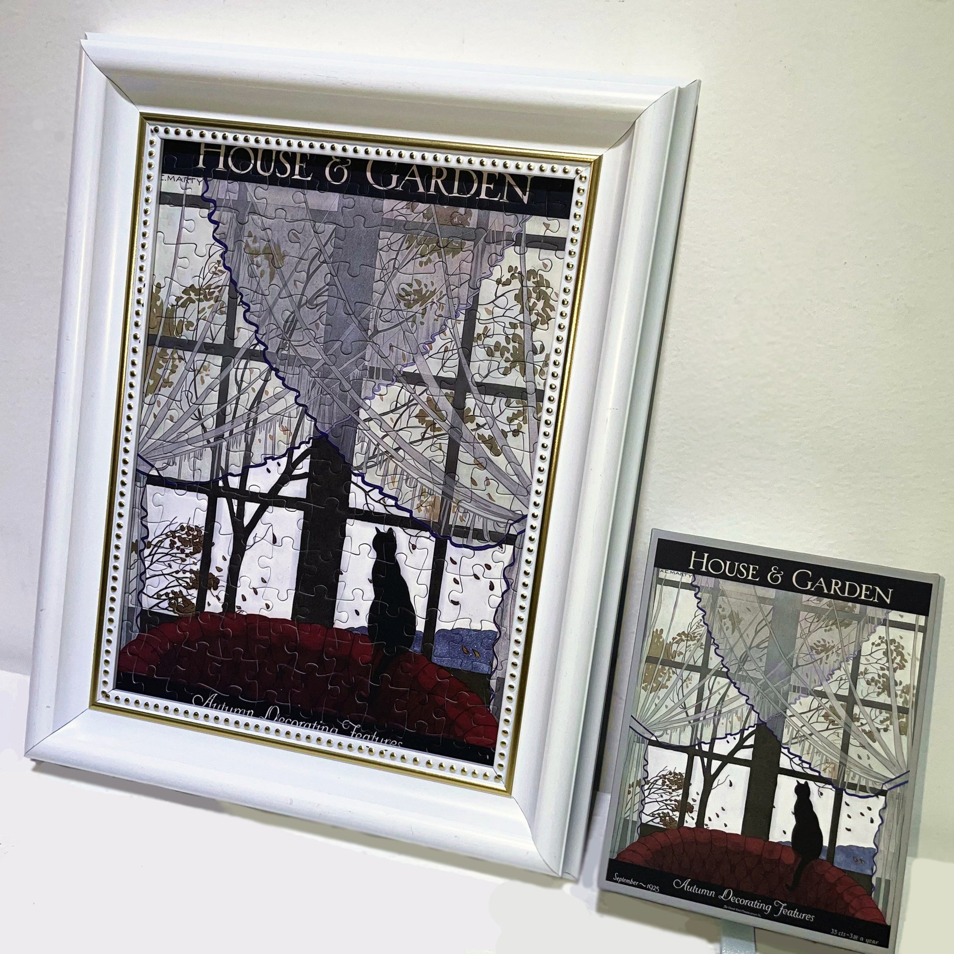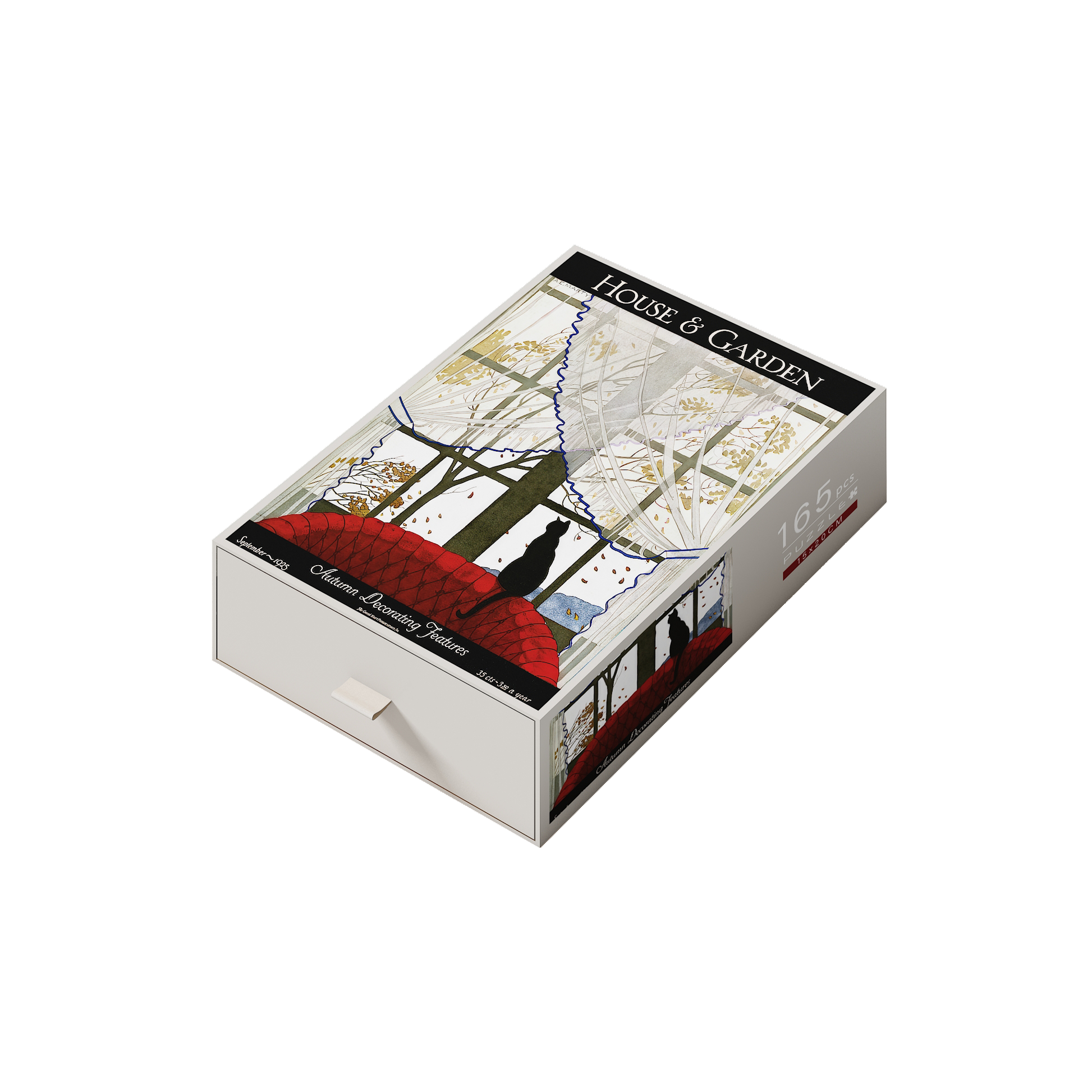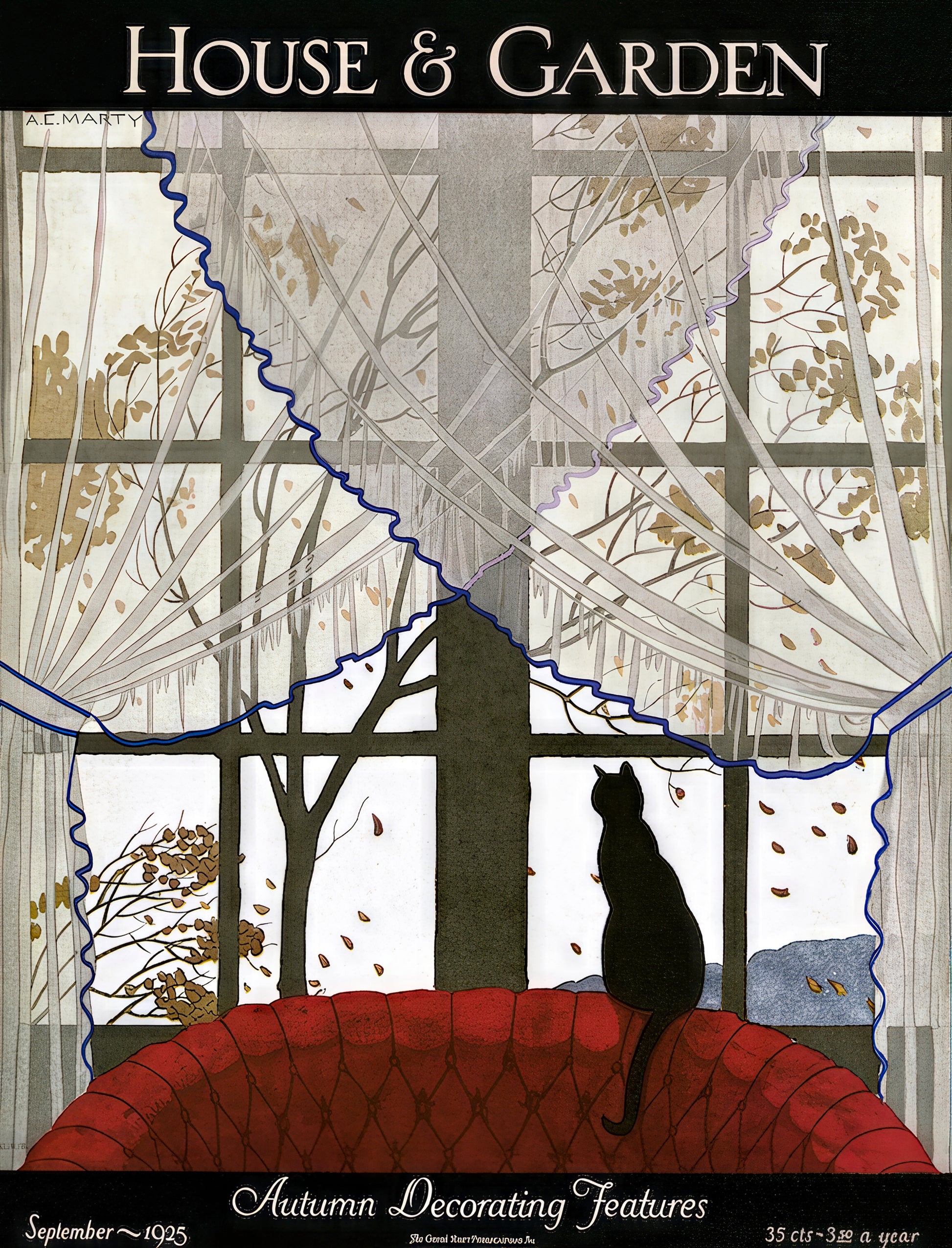 A black cat perches on a red sofa, gazing through intricate windowpanes gazing out on the outside world. With muted tones and delicate details, it captures the quiet charm of home.