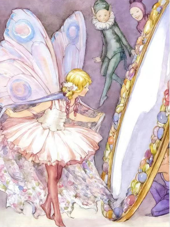 This enchanting artwork depicts a graceful fairy in a delicate, flowing dress and pastel butterfly wings, standing before a magical, jewel-encrusted mirror. πΈβ¨ She adjusts her outfit, her golden hair braided and adorned with flowers, while two elves peek out from behind the mirror, adding a touch of intrigue to the scene. The soft watercolor palette and ethereal details evoke a sense of fantasy and wonder, making it a captivating piece for dreamers and lovers of fairy tales