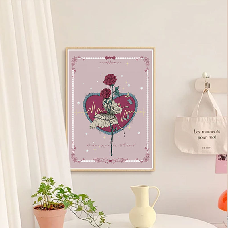 This elegant artwork blends romance and resilience, featuring deep red roses, a delicate butterfly, and a heartbeat-lined heart. With vintage-inspired details and soft pastel tones, it’s a poetic expression of love and emotion, perfect for any space or collection.